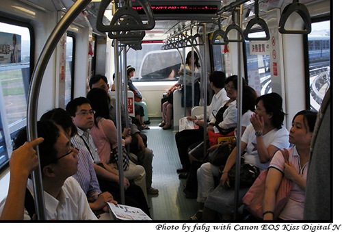 通常這種機場內的捷運都兩、三公里短程的接駁,只是從這棟大樓載到另一棟大樓而已,標準是兩節車箱,功能上想像一下有點像是橫向的電梯功能,所以位子不是很多,實際上也不需要很多,因為通常搭不會超過三分鐘的,這類的車箱我們稱為中運量捷運。
