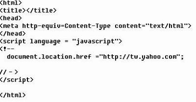 有時候例如說網站搬家,或者我們想直接將這個網址導向另外一個index2.html,都可以這樣做,將下面的程式碼存成存文字檔的index.htm,最關鍵的程式段就是 document.location.href=”http://tw.yahoo.com“;,網址可以輸入想要導向的網址”http://tw.yahoo.com“或者直接指到本站的另一個index,例如”./index2.html”