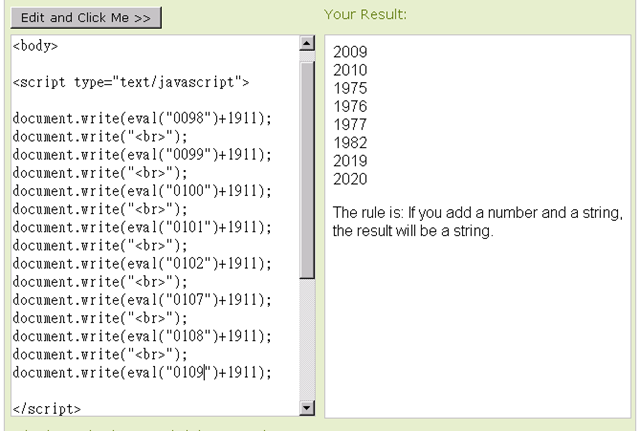 這段程式若沒改會一路從民國100年錯到107年,以上結果可以自行上網測試看看 http://www.w3schools.com/js/tryit.asp?filename=tryjs_variables