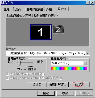 1.桌面→右鍵→內容→設定值→進階