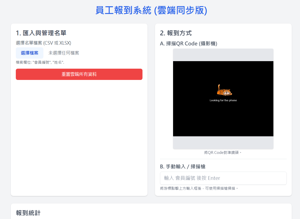 這是一個雲端報到系統,旨在簡化和自動化員工的報到過程。使用者可以通過掃描 QR Code 或手動輸入會員編號來完成報到,並且可以輕鬆管理參與者名單。