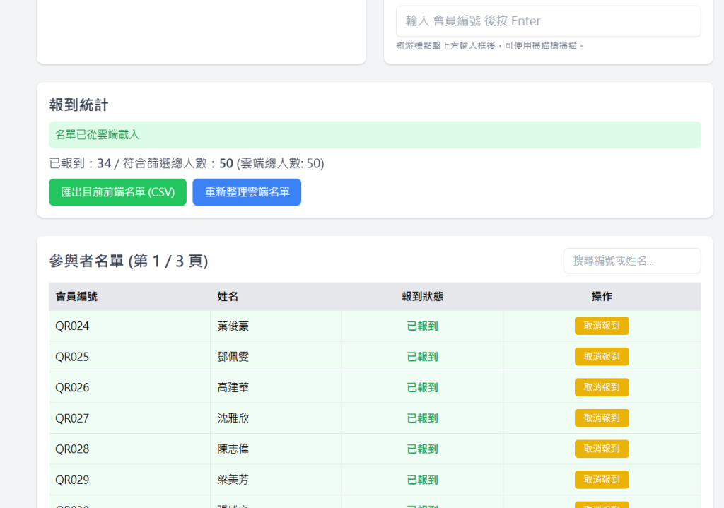 - 報到統計:顯示已報到人數和符合篩選條件的總人數。